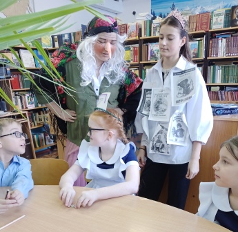 В проведении библиотечного урока приняли активное участие обучающиеся 6 Б класса, в роли Бабы Яги выступила Ткаченко Дарья, в роли Книжной феи - Лихалетова Виолетта.