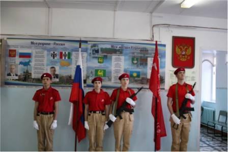 ребята с гордостью водрузили символ Победы на флагшток. Следующая знаменная группа вносит флаг РФ, звучит гимн. Торжественная линейка объявляется открытой.