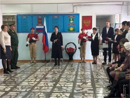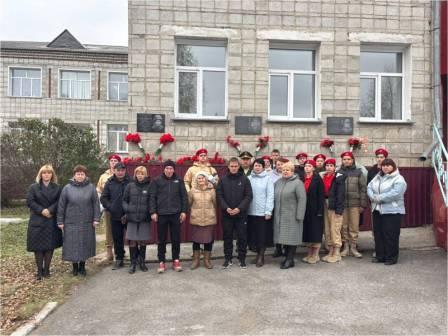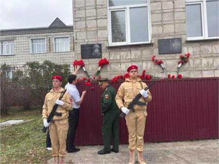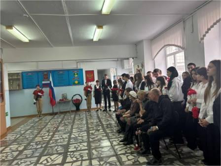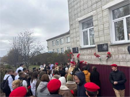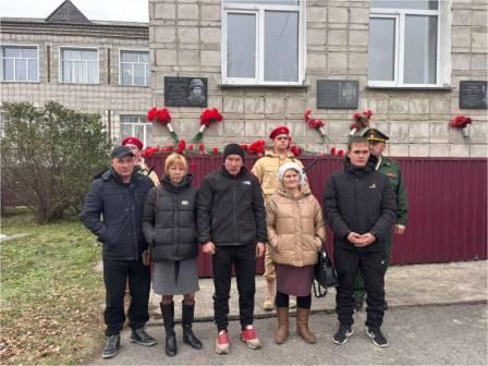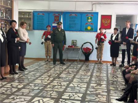 Память героически погибшего солдата почтили минутой молчания. Участники митинга возложили цветы к мемориальному знаку на фасаде школы.