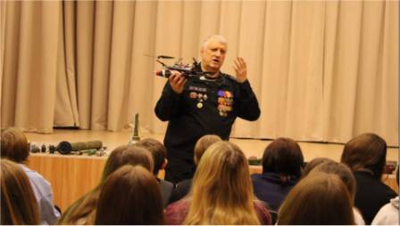 Присутствующих в зале познакомили с инженерными боеприпасами, наглядно представив различные виды таких устройств.